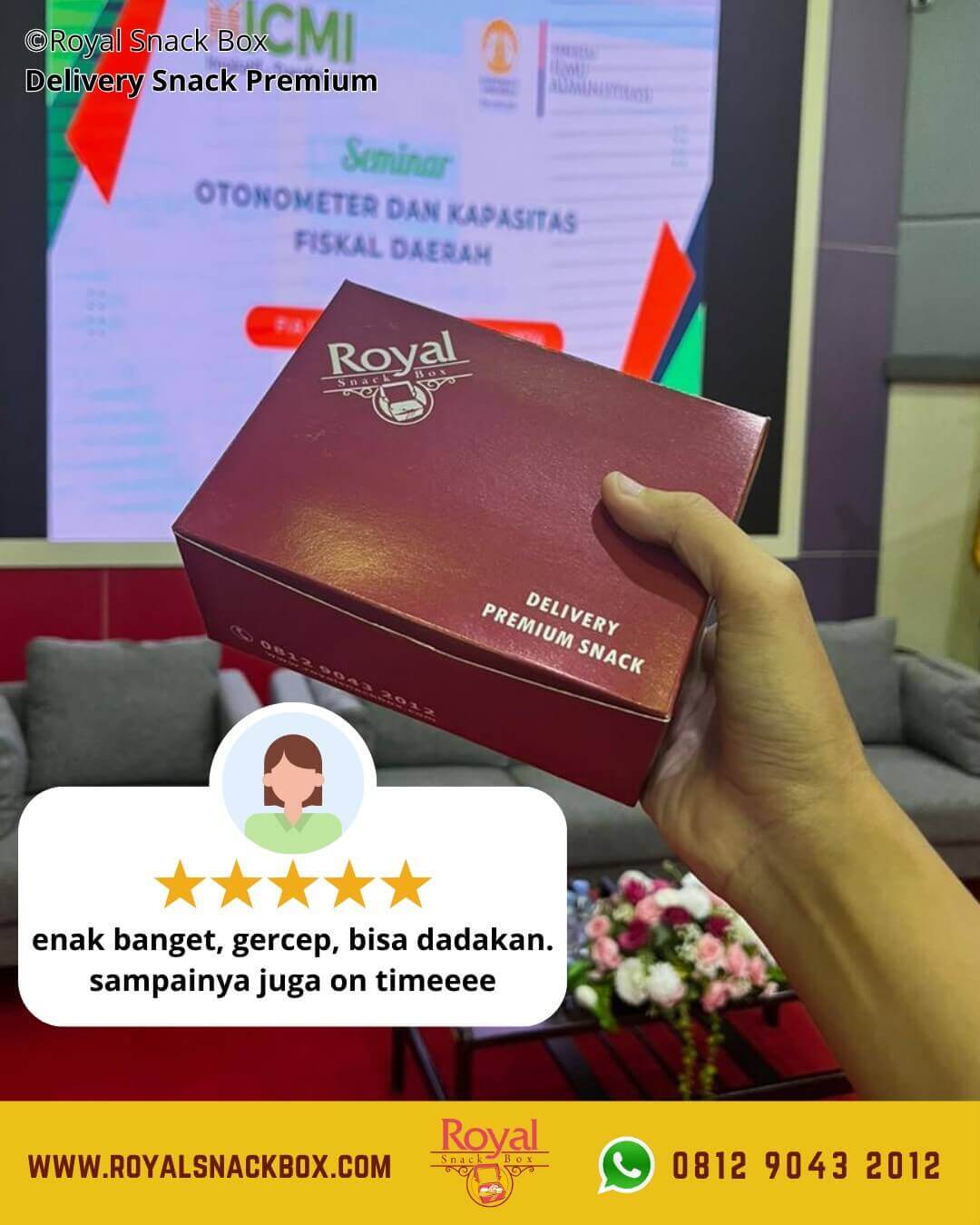 Jika tidak mau bingung soal kemasan snack box lebih baik pesan di katering yang sudah menyediakan pengemasan secara profesional seperti Royal Snack Box. Dijamin makanan Anda akan aman sampai ke tujuan, cukup hubungi 0812-9043-2012 atau email ke order@royalsnackbox.com untuk memilih paketnya saja.