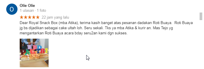 Keesokan harinya Ibu Tini langsung menghubungi Royal Snack Box bahwa pesanan Roti Buayanya sudah diterima dan masih dalam keadaan bagus dan rapih, Calon pengantin laki – laki siap membawa Roti Buaya untuk diserahkan kepada calon mempelai wanita. Terimakasih Royal Snack Box sudah membantu Acara pernikahan Putra kami semoga sukses dan selalu menjadi penyedia Roti Buaya yang unik dan enak untuk simbol acara pernikahan atau seserahan.