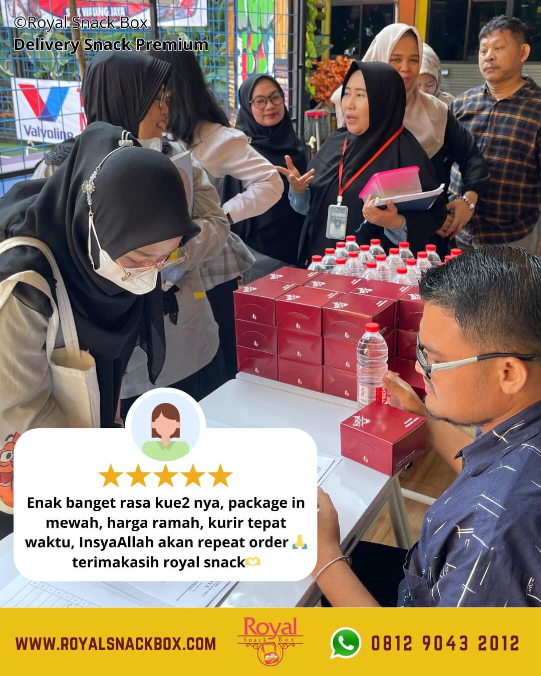 Bila Anda mengadakan acara besar dan membutuhkan snack box dengan jumlah banyak, penggunaan jasa delivery akan sangat membantu. Anda tidak perlu repot mencari transportasi yang aman untuk mengambil pesanan dan membawanya, karena semua sudah disiapkan pihak jasa catering. Jika ingin kemudahan seperti ini, Royal Snack Box dapat Anda andalkan.